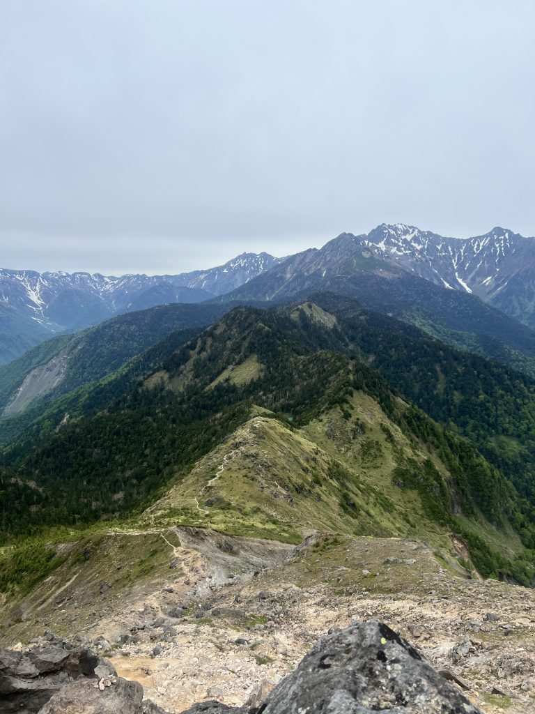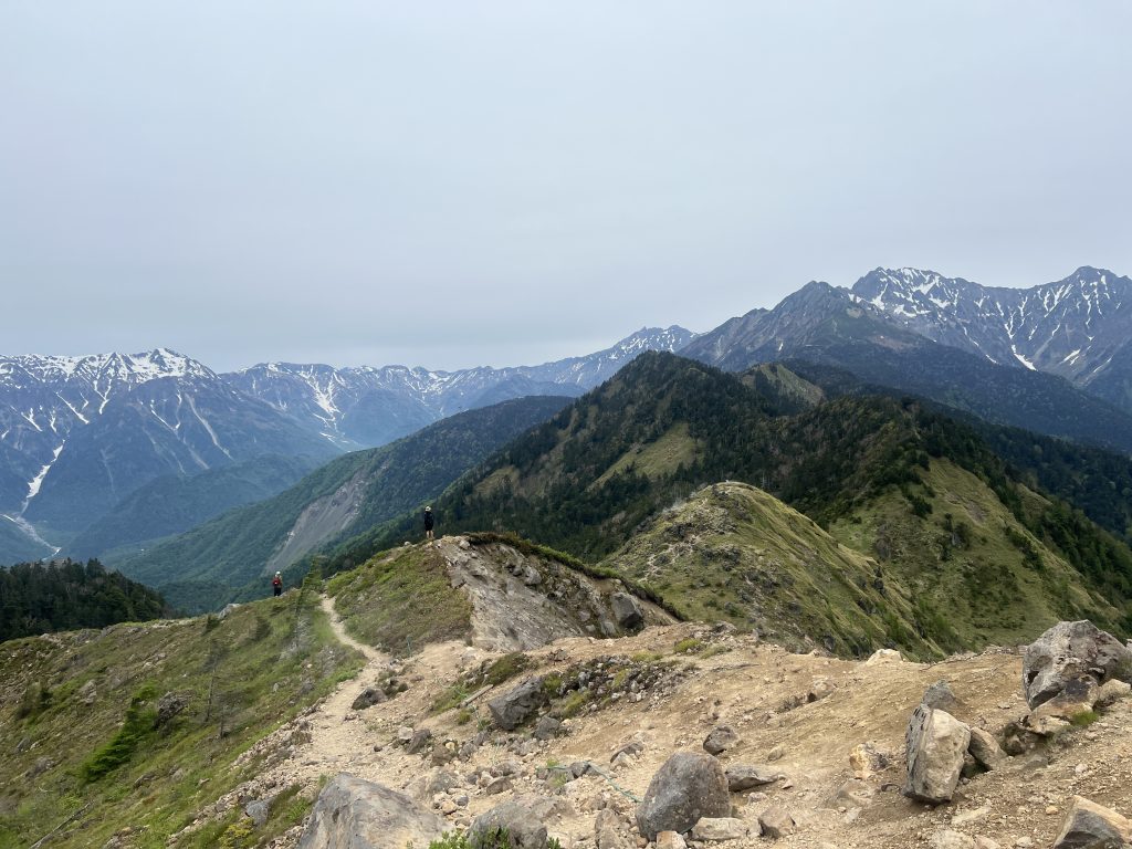 周りはひらけていて、冬季に行った西穂高方面がよく見えていた。まだ連峰の鞍馬には雪が残る6月…、結構冷える。