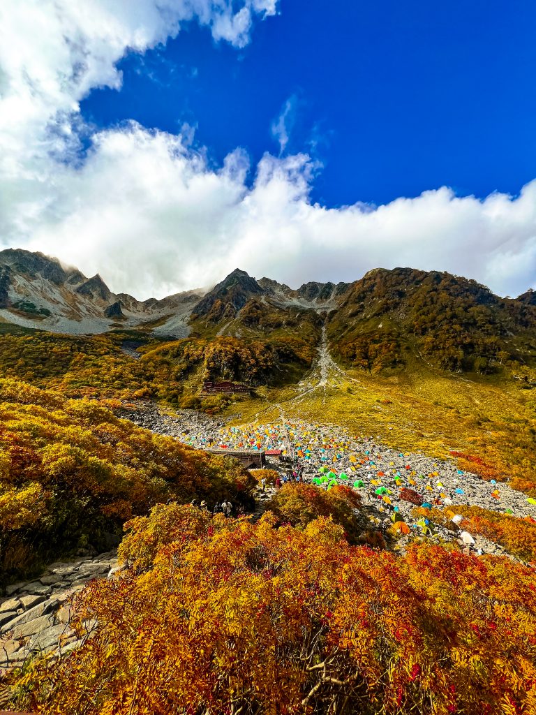 調べると紅葉時期の週末の涸沢カールは1000張り近いテント、激混み、登山道渋滞は必須!